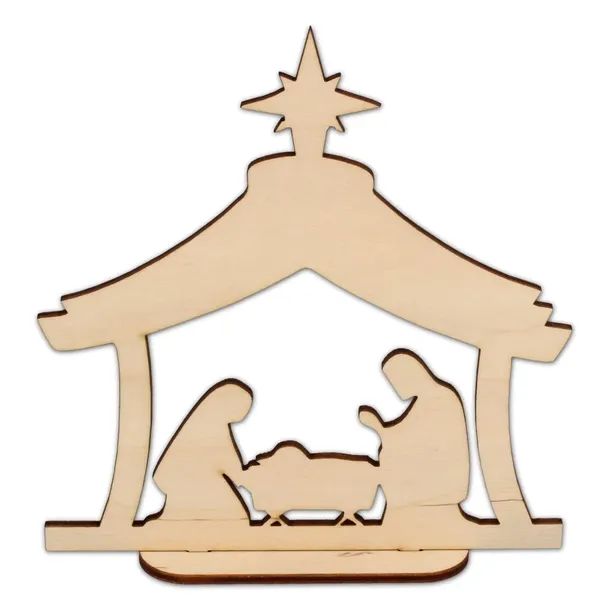 Dekoracja świąteczna ze sklejki w kształcie szopki. Podstawka dołączona do szopki umożliwia postawienie dekoru bez konieczności podparcia. Doskonale prezentuje się zarówno w formie surowej, jak i ozdobionej rozmaitymi technikami decoupage.