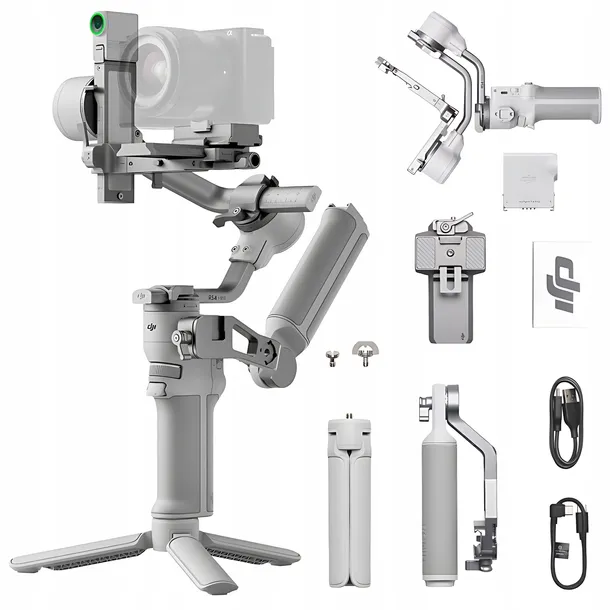 - Gimbal, Kabel do ładowania USB-C (40 cm), Kabel MCC w kształcie litery L (USB-C, 30 cm), Moduł inteligentnego śledzenia RS, Płytka szybkiego montażu, Statyw RS 4 Mini, Uchwyt RS 4 Mini Briefcase Handle, Zestaw śrub