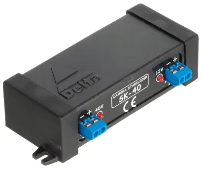 Stabilizator kamer SK-40 przeznaczony jest do zasilania kamery, lub kamery z termostatem; Napięcie zasilania: 20 V ... 40 V DC ; Napięcie wyjściowe: 12 V DC ; Wydajność prądowa zasilacza: 0.9 A ;