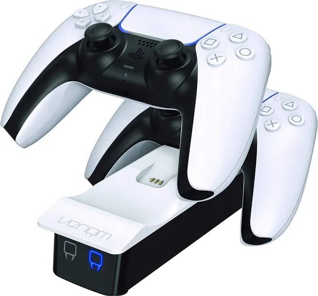 Stacja dokująca Venom pozwoli Ci ładować jednocześnie 2 pady do konsoli PS5. Dzięki niej kontrolery będą zawsze gotowe do użycia. W zestawie dwa wtyki USB-C pozwalające na wpinanie kontrolerów w stacje celem ładowania.