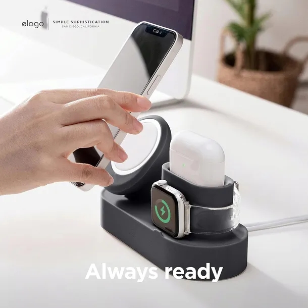 Ładuj jednocześnie iPhone'a, AirPods oraz Apple Watch, dbając o porządek dzięki specjalnym otworom do zarządzania kablami. Trwały silikon zabezpieczy Twoje urządzenia przed zarysowaniami.