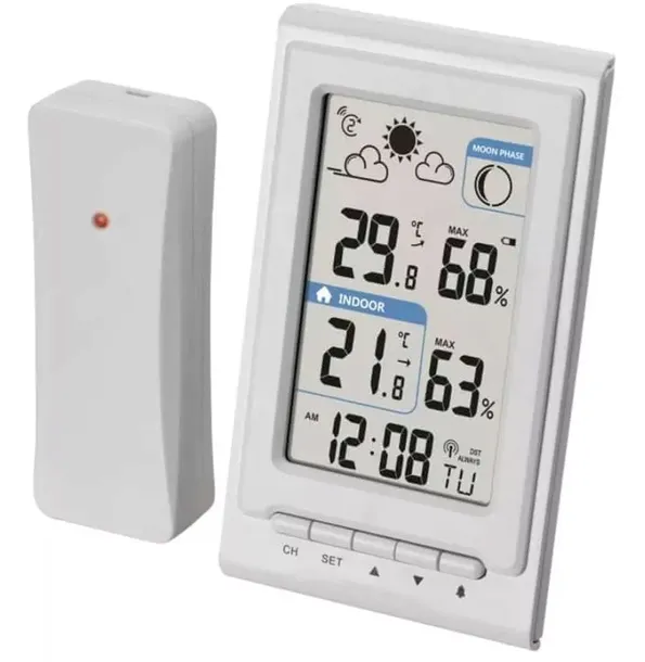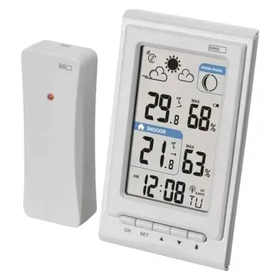 12/24 godzinny format czasu: tak|barometr: nie|budzik: tak|ciągłe podświetlenie: nie|częstotliwość: 433 MHz|data: tak|deszczomierz: nie|dodatkowe czujniki: 3(E05018)|fazy Księżyca: tak|jednostki temperatury: °C/°F|kalendarz: tak|min. i maks. temperatura: tak|możliwość zawieszenia na ścianie: tak|opakowanie: 1 szt., pudełko|ostrzeżenie temperaturowe: nie|podświetlany kolorowy wyświetlacz (black mask): nie|podświetlenie LED wyświetlacza: nie|podświetlenie wyświetlacza: nie|powtarzane budzenie: tak|produkt: stacja meteorologiczna|prognoza pogody: tak|projekcja: nie|sonda przewodowa do czujnika: nie|strefy czasowe: tak|temperatura wewnętrzna: -10 °C do +50 °C, rozdzielczość 0,1 °C|temperatura zewnętrzna: -40 °C do +60 °C, rozdzielczość 0,1 °C|trend ciśnienia: nie|trend temperatury: tak|ustawianie wysokości nad poziomem morza: nie|wiatromierz: nie|wilgotność wewnętrzna: 1 % do 99 % RH, rozdzielczość 1 %|wilgotność zewnętrzna: 20 % do 95 % RH, rozdzielczość 1 %|wykonanie termometru: bezprzewodowe|wymiary czujnika: 21 × 38 × 100 mm|wymiary głównej jednostki: 23 × 76 × 126 mm|wymiary wyświetlacza: 50 × 81 mm|zasięg czujnika: do 30 m|zasilacz sieciowy: nie|zasilanie czujnika: 2× 1,5 V AA (brak w zestawie)|zasilanie jedn. głównej: 2× 1,5 V AAA (brak w zestawie)|zegar: DCF (sterowany sygnałem radiowym)