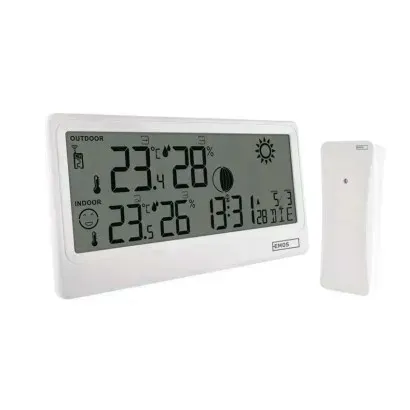 12/24 godzinny format czasu: tak|barometr: nie|budzik: tak|ciągłe podświetlenie: nie|częstotliwość: 433 MHz|data: tak|deszczomierz: nie|dodatkowe czujniki: 3 (E00387, E05018)|fazy Księżyca: tak|jednostki temperatury: tak|kalendarz: tak|kompatybilność: –|min. i maks. temperatura: tak|możliwość zawieszenia na ścianie: tak|obsługiwany OS: –|opakowanie: 1 szt., pudełko|ostrzeżenie temperaturowe: tak|podświetlany kolorowy wyświetlacz (black mask): nie|podświetlenie LED wyświetlacza: nie|podświetlenie wyświetlacza: nie|powiadomienia do aplikacji mobilnej: –|powtarzane budzenie: tak|pozostałe funkcje: #|produkt: stacja meteorologiczna|prognoza pogody: tak|projekcja: nie|protokół: –|sonda przewodowa do czujnika: nie|sterowanie za pomocą asystentów głosowych: –|strefy czasowe: tak|temperatura wewnętrzna: -10 °C do +50 °C, rozdzielczość 0,1 °C|temperatura zewnętrzna: -40 °C do +70 °C, rozdzielczość 0,1 °C|trend ciśnienia: nie|trend temperatury: tak|ustawianie wysokości nad poziomem morza: nie|wiatromierz: nie|wilgotność wewnętrzna: 20 % do 95 % RH, rozdzielczość 1 %|wilgotność zewnętrzna: 20 % do 95 % RH, rozdzielczość 1 %|wykonanie termometru: bezprzewodowe|wymiary czujnika: 38 × 20 × 100 mm|wymiary głównej jednostki: 215 × 18 × 113 mm|wymiary wyświetlacza: 191 × 74 mm|zasięg czujnika: do 80 m|zasilacz sieciowy: nie|zasilanie czujnika: 2× 1,5 V AA (brak w zestawie)|zasilanie jedn. głównej: 3× 1,5 V AA (brak w zestawie)|zegar: DCF (sterowany sygnałem radiowym)