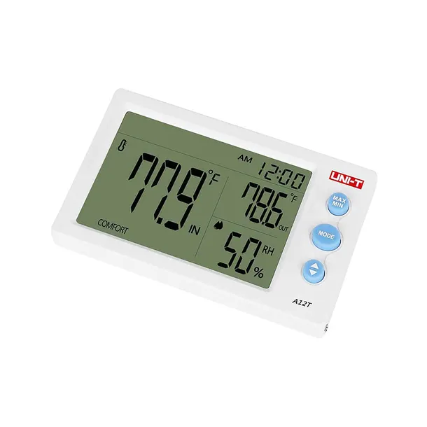 Uni-T A12T oferuje funkcję śledzenia wartości maksymalnych i minimalnych, co pozwala na monitorowanie ekstremalnych warunków. Wbudowany budzik i zegar, który obsługuje formaty 12- oraz 24-godzinny, zwiększają wygodę użytkowania. Zewnętrzny czujnik przewodowy pozwala na monitorowanie temperatury i wilgotności w różnych lokalizacjach, co daje większą elastyczność w zarządzaniu warunkami w różnych częściach domu czy biura.