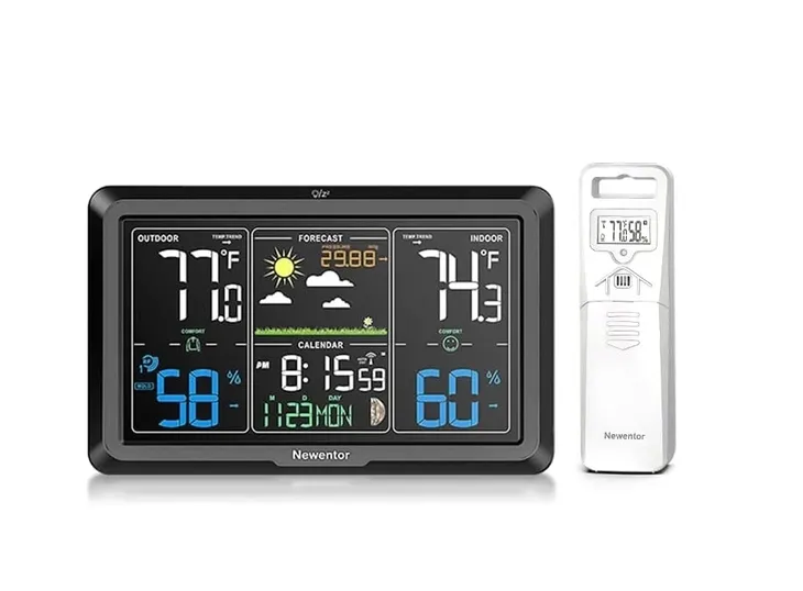 WIELOFUNKCYJNA DOMOWA STACJA POGODOWA Z DUŻYM 7,5-calowym ekranem: Zegar pogodowy Newentor zawiera wiele funkcji do wykrywania temperatury i wilgotności na zewnątrz w pomieszczeniu, zegara atomowego i kalendarza oraz faz księżyca, ciśnienia atmosferycznego i prognozy pogody oraz trendów, wskaźnika pleśni i punktu rosy oraz wskaźnika ciepła, odzieży indeks i indeks komfortu itp.