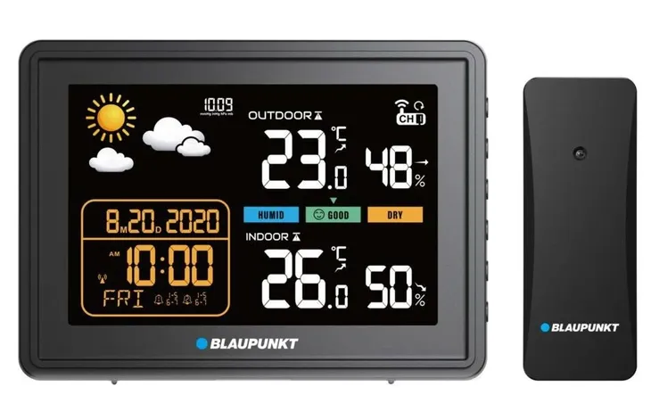 Niezależnie od pory roku, dbaj o swój komfort termiczny!Pomoże Ci w tym stacja pogodowa BLAUPUNKT WS30BK, która wyświetli temperaturę i wilgotność zarówno w pomieszczeniu, jak i na zewnątrz. Podpowie Ci, czy w salonie masz zbyt sucho, czy zbyt wilgotno, czy jest w sam raz! Oprócz tego dowiesz się jakie jest aktualne ciśnienie atmosferyczne i jaka jest prognoza pogody na najbliższy dzień. Zegar z alarmem i kalendarzem też na pewno Ci się przydadzą w codziennym życiu.