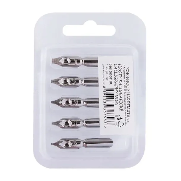 Zestaw pięciu płaskich stalówek do nasadki pióra maczanego. Stalówki są numerowane i dostępne w pięciu różnych grubościach: 1- 3,15 mm, 2- 2,05 mm, 3- 1,35 mm, 4- 0,95 mm, 5- 0,75 mm.