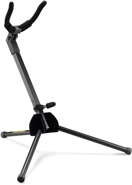 Statyw na saksofon altowy. Jest to statyw kompaktowy, który łatwo i szybko można złożyć. Aksamitne nakładki ochronią instrument przed zarysowaniami.