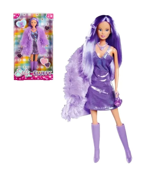 Lalka modowa Steffi 29 cm. Steffi ma na sobie modny strój składający się z fioletowej sukienki z cekinami i dopasowanej futrzanej kurtki, torebki w kształcie motyla, butów, naszyjnika i fioletowych kolczyków. Ma długie fioletowe włosy i spinki we włosach.