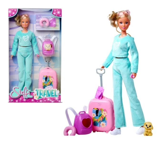 W zestawie znajduje się różowa walizka na kółkach z tropikalnym nadrukiem, którą Steffi może ciągnąć za wysuwaną rączkę.
