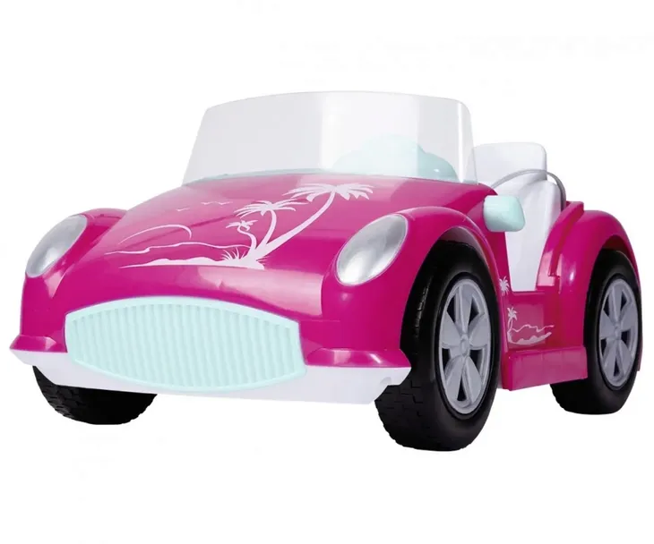 Steffi ubrana jest w modną, akwarelową sukienkę.Samochód plażowy ma obracające się koła, otwierany dach i siedzenia dla dwóch osób. Jest w kolorze różowym z turkusowymi elementami i białymi siedzeniami oraz srebrnymi kołami i ładnym, plażowym nadrukiem na masce i drzwiach, długość 29 cm, 3l+