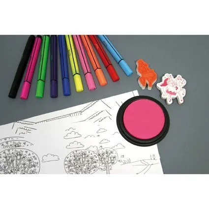 Zestaw 20 gumowych stempelków z piankowymi rączkami. W zestawie dodatkowo jedna okrągła gąbeczka z różowym tuszem D:7 cm, 12 markerów o ergonomicznym, trójkątnym kształcie i 12 papierowych scenerii do pokolorowania. Dołączony tusz z łatwością zmywa się ze skóry i spiera z ubrań. Wymiary zestawu D: 11,3 cm, H: 15 cm. Polecane od czwartego roku życia.