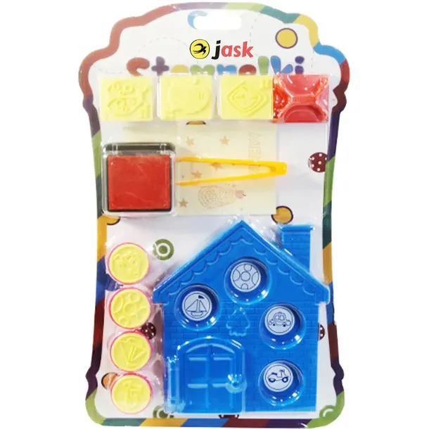 Kolorowy zestaw stempelków wraz z gąbeczką, kartkami i pęsetą i domkiem gdzie można odłożyć stempelki aby się nie zgubiły. Stempelki z motywem jedzenia, pojazdami i zwierzątkami. Zestaw pozwoli stworzyć dzieciom unikalne prace. Podane wymiary stanowią wymiar opakowania. Produkt zapakowany w kartonową podstawkę z przezroczystym kloszem.