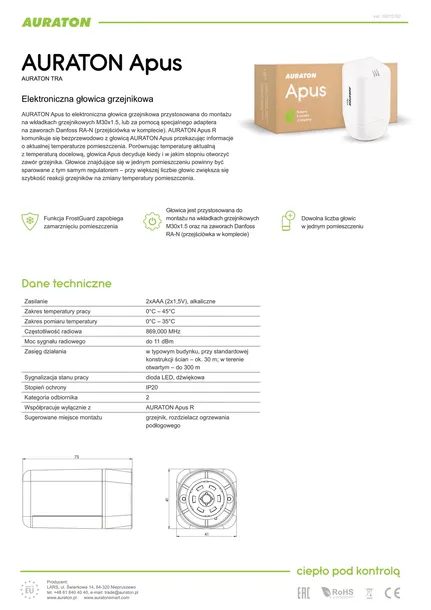 Głowica Auraton Apus to elektroniczna głowica grzejnikowa współpracująca z regulatorem temperatury Auraton Apus R. Głowica Auraton Apus przystosowana jest do montażu na wkładkach grzejnikowych M30x1.5 lub, za pomocą specjalnego adaptera, na zaworach Danfoss RA-N (przejściówka w komplecie). Auraton Apus komunikuje się bezprzewodowo z regulatorem Auraton Apus R pobierając informacje o aktualnej temperaturze pomieszczenia. Porównując temperaturę termostatu oraz temperaturę w swoim otoczeniu podejmuje decyzję kiedy i w jakim stopniu, proporcjonalnie do potrzeb, otworzyć zawór grzejnika. Głowice znajdujące się w jednym pomieszczeniu powinny być skojarzone z tym samym termostatem – przy większej ilości głowic zwiększa się szybkość reakcji grzejników na zmiany temperatury pomieszczenia, co jest bardzo korzystne.