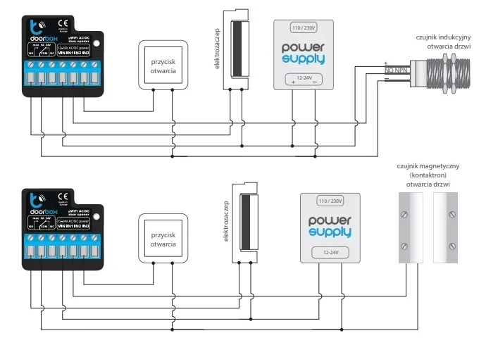 - doorBox wyposażony został w wyjście przekaźnikowe mogące sterować elementami wykonawczymi o natężeniu 5A i napięciu 12 - 24V AC/DC bez wykorzystania dodatkowych elementów zewnętrznych
