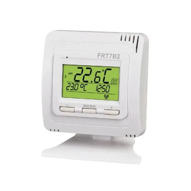 Uniwersalny bezprzewodowy, programowalny termostat Elektrobock FRT7B2 służący do sterowania kotłami centralnego ogrzewania na gaz, elektrycznymi i na paliwo stałe (węgiel, ekogroszek itp.), panelami na podczerwień, grzejnikami olejowymi, elektrycznym ogrzewaniem podłogowym, pompami wodnymi, promiennikami ciepła, dowolnymi grzejnikami elektrycznymi itp.