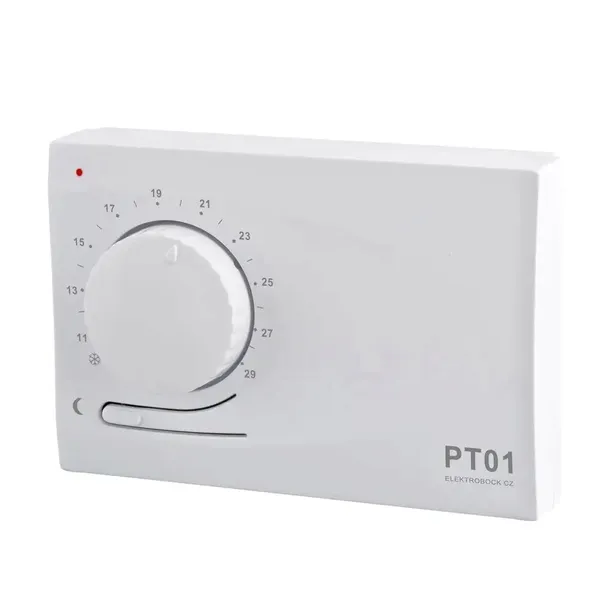 Tani i prosty termostat przewodowy Elektrobock PT01 z pokrętłem regulacji temperatury służący do automatycznego sterowania kotłami centralnego ogrzewania na gaz, węgiel, ekogroszek i olej.z automatyką pracującą w trybie włączy / wyłącz.
