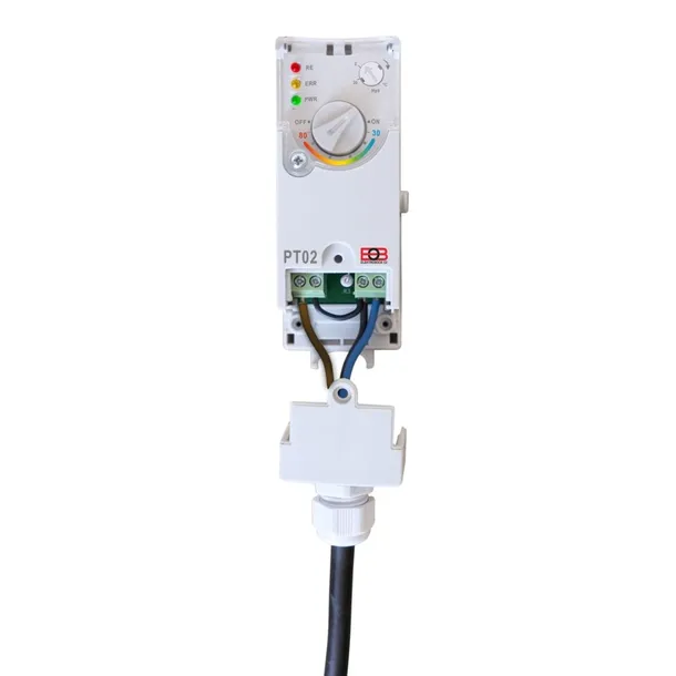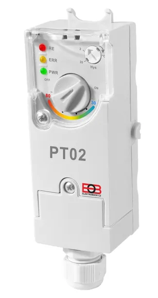 Elektroniczny termostat przylgowy Elektrobock PT02 służy załączania i wyłączania pomp obiegowych w zależności od ustawionej temperatury i histerezy. Zaletą jest regulowana histereza (2 °C do 20 °C), łatwa regulacja sterowania temperaturą i prosty montaż bezpośrednio na powierzchni rury. Termostat posiada funkcję ochrony przed osadzaniem się kamienia w pompie. Mocowanie do rury sprężynującą opaską. Elementy sterujące i styki podłączeniowe zabezpieczone osłonami z tworzywa sztucznego mocowanymi za pomocą śrub.