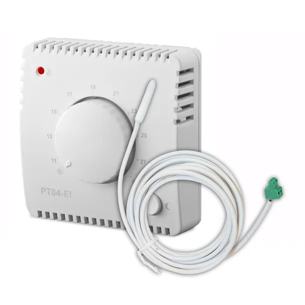 Termostat przewodowy Elektrobock PT04-EI z zewnętrznym czujnikiem temperatury na 3 metrowym przewodzie ma zastosowanie do dowolnego ogrzewania elektrycznego. Termostat może sterować panelami na podczerwień, grzejnikami elektrycznymi, grzejnikami olejowymi promiennikami, elektrycznym ogrzewaniem podłogowym itp.