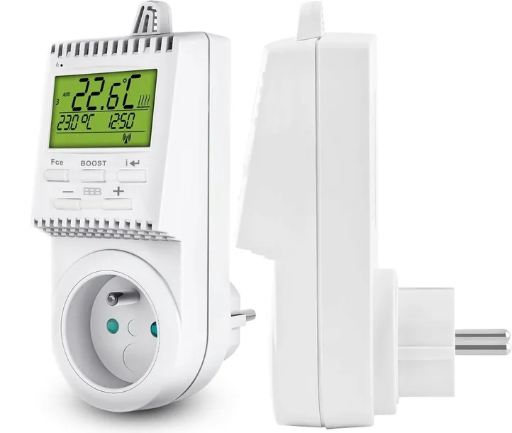 cyfrowe gniazdo przełączane termicznie do automatycznej regulacji elektrycznych systemów ogrzewania i chłodzenia (grzejniki, suszarki do ręczników, kominki, klimatyzacja) w domach jednorodzinnych, mieszkaniach, biurach. Dla każdego dnia można ustawić do sześciu przedziałów czasowych z różnymi poziomami temperatury. Nadaje się do miejsc, w których stosuje się przełączanie między NT i VT (taryfa niska i wysoka). Takie krótkotrwałe wyłączenie nie skraca żywotności urządzenia, a dzięki podtrzymaniu czasowemu urządzenie działa w ustawionym programie po przywróceniu zasilania.