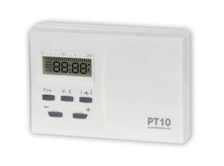 PT10 jest programowalnym termostatem do automatycznej regulacji ogrzewania z możliwością ustawienia 4 cieplnych pasm czasowych, dowolnych na każdy dzień, (min.nastawionego pasma to 30 min.).