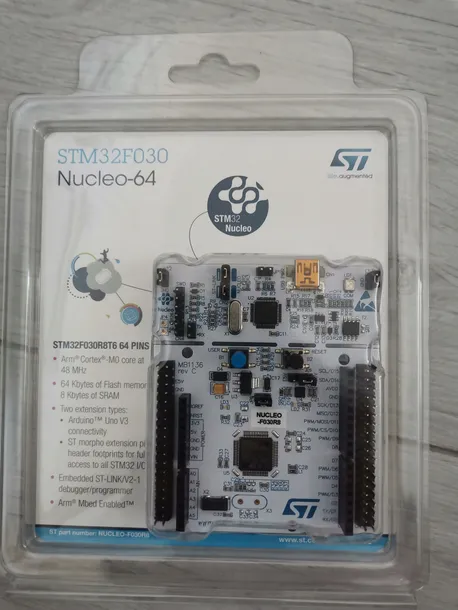 Moduł z 32-bitowym mikrokontrolerem wyposażonym w rdzeń ARM Cortex M0, 48 MHz, 64 kB Flash, 8 kB RAM. Nucleo jest kompatybilny z platformą mbed, posiada złącza umożliwiające podłączenie nakładek Arduino tzw. Arduino Shield.