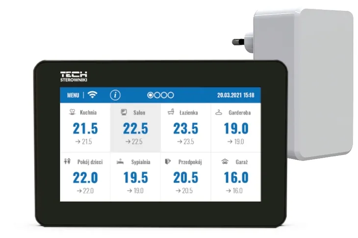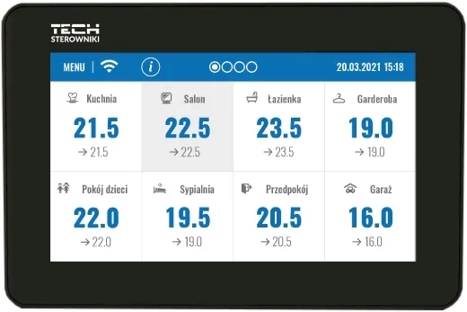Aby dokonać ustawień w podrzędnej sterownikowi strefie, wystarczy kliknąć obszar ekranu z informacją o jego stanie. Wygląd wyświetlacza panelu kontrolnego sterowników ogrzewania można dopasować do swoich potrzeb, korzystając z funkcji ustawienia ekranu. Można m.in. ustawić wygaszacz ekranu w postaci zegara albo daty. Dodatkowo użytkownik ma możliwość wyboru wersji kolorystycznej ekranu sterownika oraz włączenia lub wyłączenia dźwięku klawiszy.