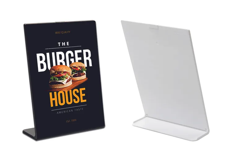 Stojak w kształcie litery L dostępny jest w dwóch formatach: A5 i A6, co pozwala na wybór odpowiedniego rozmiaru w zależności od potrzeb. Ponadto, stojak jest dostępny w dwóch kolorach: białym i czarnym, dzięki czemu bez trudu pasuje do wystroju lokalu.