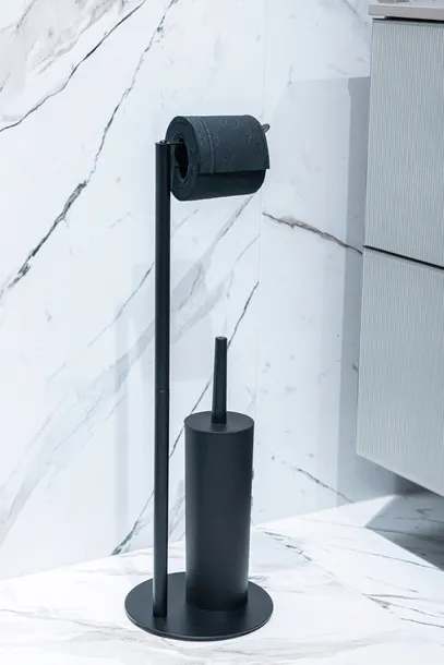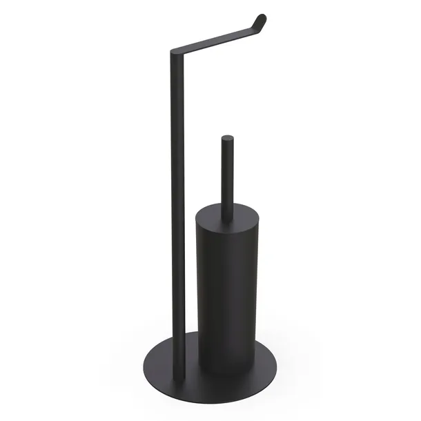 Nowoczesny i minimalistyczny stojak na papier toaletowy ze szczotką WC. Wykonany został ze stali malowanej na kolor czarnego matu. Posiada stabilną, okrągłą podstawę. Wewnątrz pojemnika na szczotkę toaletową znajduje się wyjmowany wkład z tworzywa ułatwiający utrzymanie higieny. Produkt wymaga samodzielnego skręcenia.