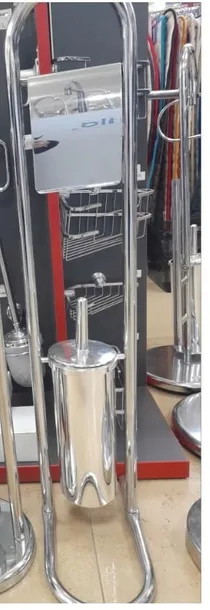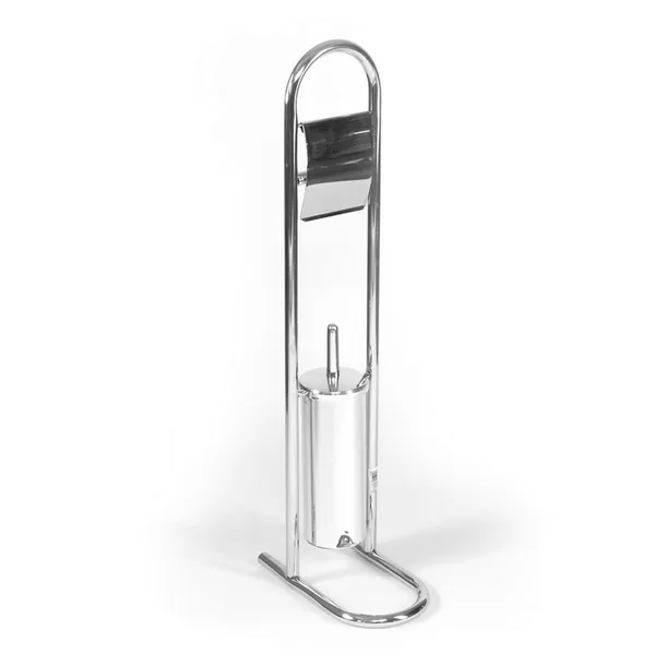 Stojak łazienkowy na papier toaletowy z podwieszaną szczotką WC. Wykonany został z błyszczącej stali chromowanej. Rolka papieru osłonięta jest funkcjonalną klapką. Pojemnik szczotki można zdjąć, aby w łatwy sposób go wyczyścić. Szczotka WC jest dyskretnie schowana w pojemniku dzięki zastosowaniu na jej rączce estetycznej pokrywki.