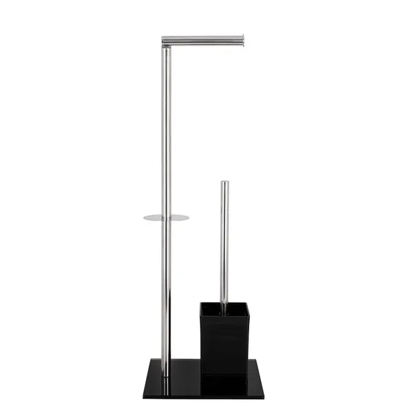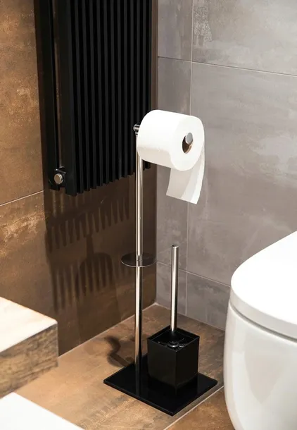 Stojak na papier toaletowy ze szczotką oraz miejscem na zapasową rolkę papieru. Posiada czarną podstawę oraz czarny pojemnik na szczotkę co nadaje mu nowoczesnego wyglądu.