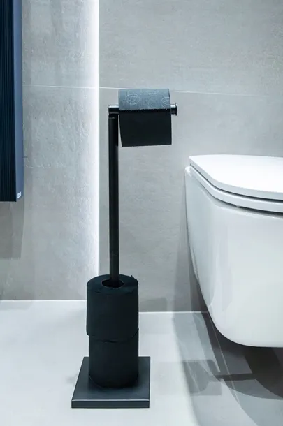 Nowoczesny i minimalistyczny stojak na papier toaletowy. Wykonany został ze stali malowanej na kolor czarny o matowym wykończeniu. Stojak łazienkowy pomieści łącznie 5 rolek papieru toaletowego.