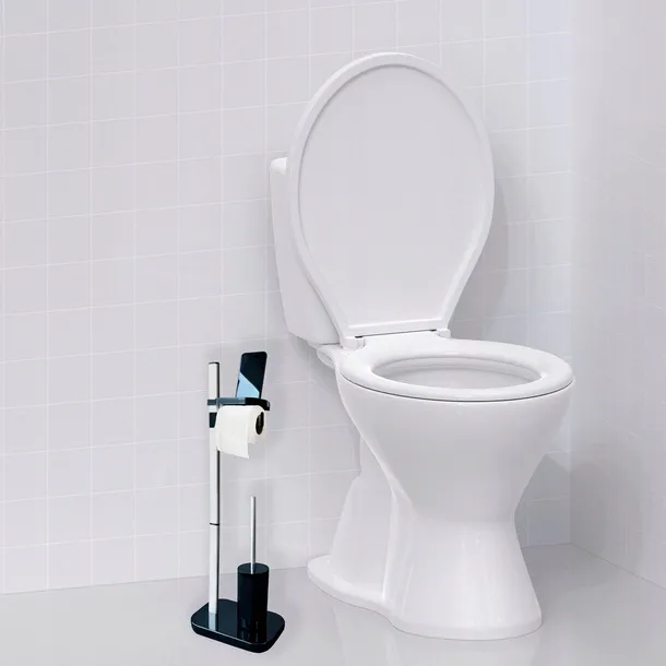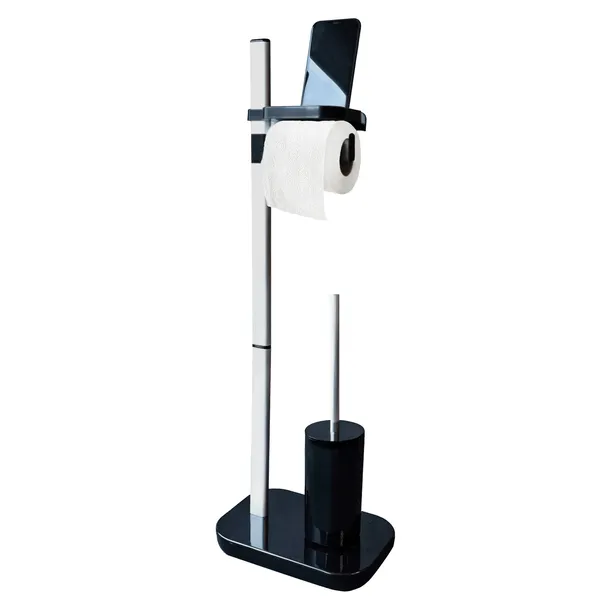 Wolnostojąca szczotka WC ze zintegrowanym uchwytem na papier toaletowy oraz półką na telefon. Stojak wykonany jest z wysokiej jakości tworzywa sztucznego malowanego na czarne. Stojak posiada solidną podstawę do której można dolać wody aby zwiększyć stabilność. Lekki stelaż umożliwia łatwe przenoszenie stojaka w dogodne miejsce.