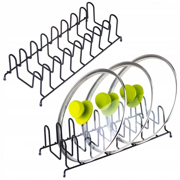 Prosty i solidny w wykonaniu nada się do każdej kuchni: małej i dużej. Dzięki wykorzystaniu drutu w jednej całości , stojak stabilnie podtrzymuje pokrywki jedna obok drugiej. Nawet zapełniony pewnie stoi na blacie roboczym i zapewnia łatwy dostęp nich łatwy dostęp.