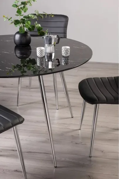 Ten okrągły czteroosobowy stół jadalny wniesie styl i styl do Twojej jadalni. Blat z efektem białego marmuru na bezpiecznym szkle ESG daje poczucie wyrafinowania i luksusu, a matowe złote wykończenie okrągłych, zwężających się nóg dodaje projektowi nowoczesnego charakteru. Stół jest wyjątkowym dodatkiem do Twojego domu.