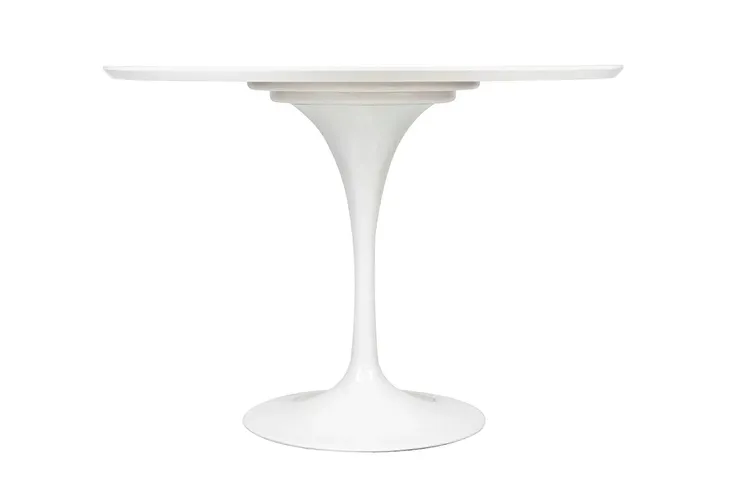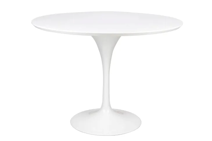Okrągły stół Tulip Premium. Blat o średnicy 100 cm, wykonany z MDF-u w kolorze biały połysk. Noga wykonana z metalu lakierowanego proszkowo na kolor biały połysk. Dopełnieniem stołu, są fotele i krzesła z kolekcji Tulip. Całość tworzy elegancki i ekskluzywny zestaw.