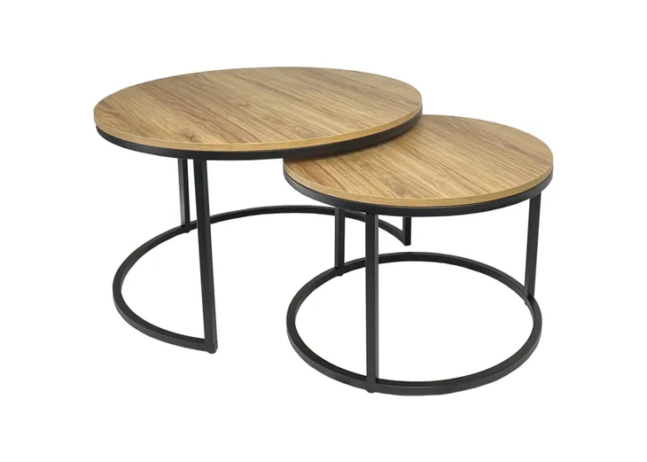 Stolik 2w1 okrągły Willy to kompletny zestaw dwóch okrągłych stolików w stylu loftowym, doskonałych dla nowoczesnych wnętrz. Duży stolik i mniejszy stolik, oba o grubości blatu 1,6 cm, wykonane z płyty laminowanej z okleiną PCV na obrzeżach dla dodatkowej ochrony. Nogi stolików są solidnie wykonane z trwałej stali, malowane proszkowo na czarno, co gwarantuje długą żywotność.