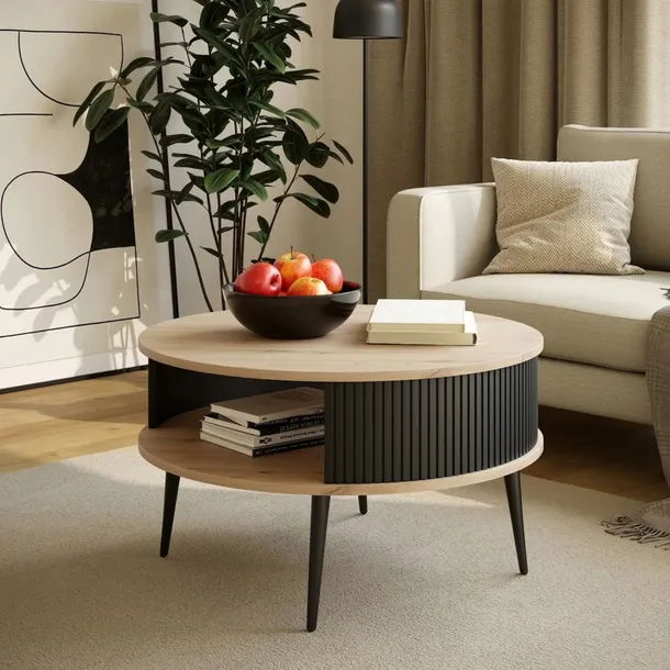 Stolik DO SALONU Okrągły Lamelowy DĄB ARTISAN Czarne Nogi NOWOCZESNY 76 cm