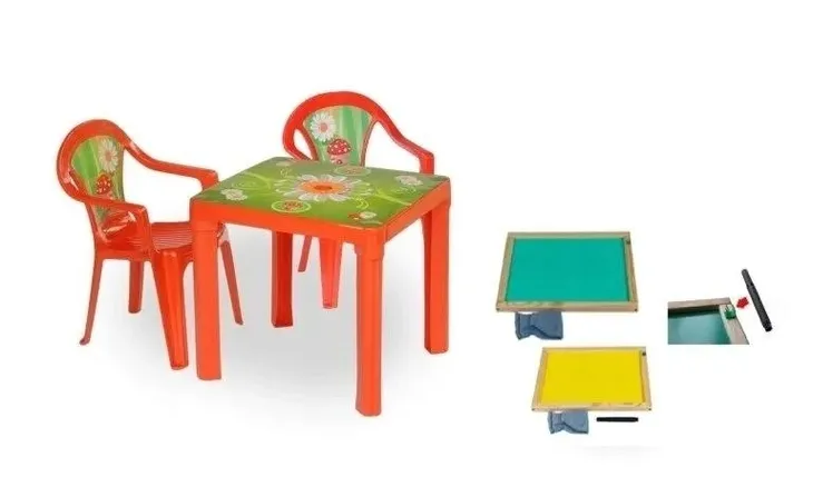 Zestaw: stolik i 2 krzesła + tablica . Kolor zestawu CZERWONY, wtopiona etykieta IML z kolorowym motywem w blat stolika i oparcie krzesła uniemożliwa jego odklejenie i gwarantuje wysoką odporność na warunki atmosferyczne, do stosowania zarówno na zewnątrz, jak i wewnątrz. Tablica kredowa z wyposażeniem (kreda biała + gąbka) o wymi. 35,5 x 28 cm.
