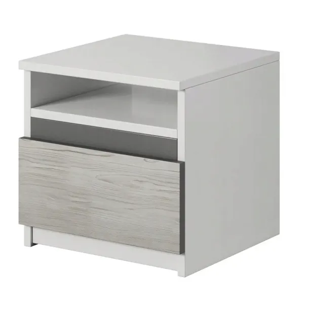 Szafka nocna z kolekcji Cornel posiada funkcjonalną szufladę oraz dodatkową półkę. Praktyczna i ergonomiczna budowa sprawdzi się także w niewielkich sypialniach.