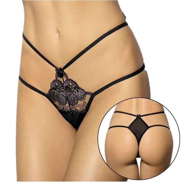 Czarna koronka z wyraźnym rysunkiem srebrzystych kwiatów dodaje kreacji tajemniczości i zapowiada intensywną rozkosz erotycznego spełnienia. Stringi świetnie leżą na pupie dzięki elastycznym paskom (gumeczki), które opinają biodra i podkreślają krągłość pośladków. Klasyczna koronka zdobi łono, a czarny romb na pośladkach, zakończony kokardką na szczycie, dodaje powabu pośladkom. Czarny kolor zniewala i pasuje do każdej stylizacji. Nie tylko wieczornej.