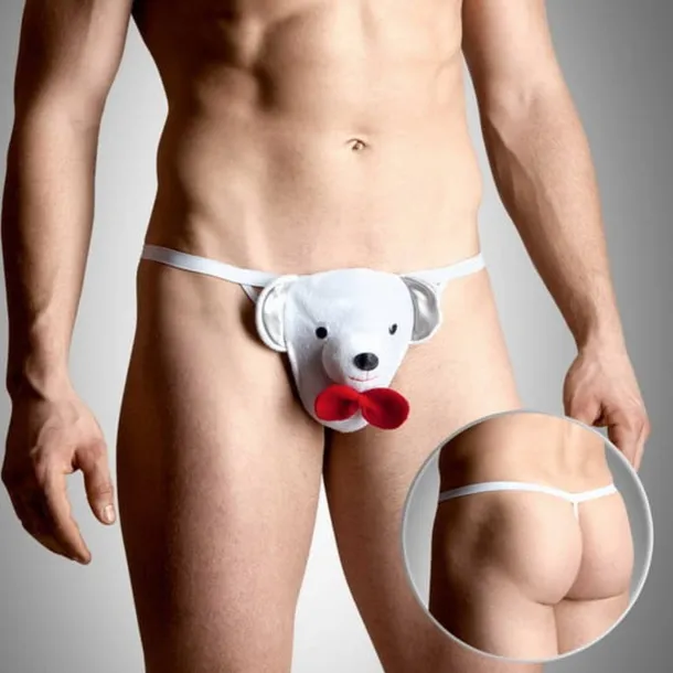 Stringi Miś. Uroczy Miś z urzekającą czerwoną kokardką będzie idealnym i bardzo oryginalnym prezentem dla mężczyzny. Zabawne stringi z miękkiego, miłego w dotyku polaru dostępne w kolorze białym.