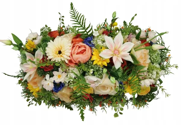 Stroik wiosenny ręcznie wykonany z różnego rodzaju sztucznych kwiatów i dodatków, osadzonych w drewnianej podstawce podstawce.