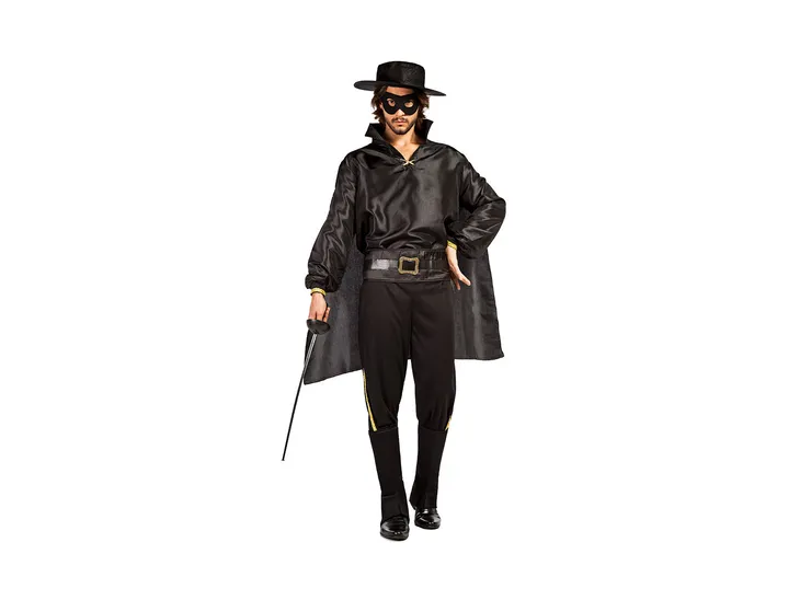 Strój Don Diego dla mężczyzn.Idealny produkt na karnawał.Zawartość: kapelusz, maska, koszula z peleryną, pas, spodnie, nakładki na buty.Rozmiar: XL.Materiał: 100% poliester.