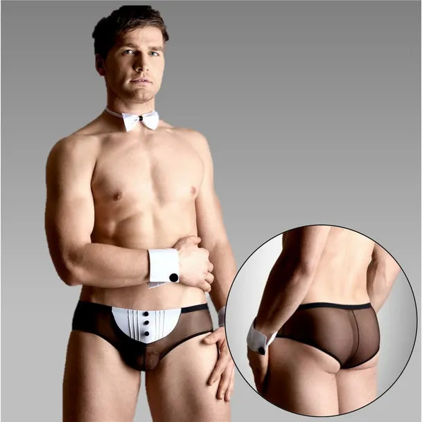Seksowny strój kelnera. Przebranie idealne dla mężczyzny, który chce zrobić niespodziankę partnerce serwując jej śniadanie do łóżka. Czarno-białe szorty z prześwitującej siateczki zdobione trzema guziczkami. W komplecie także seksowna śnieżnobiała muszka i mankiety zapinane na guzik