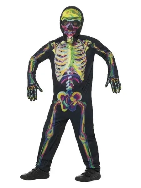 Czarny strój z wyrazistymi, kolorowymi nadrukami szkieletu.