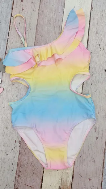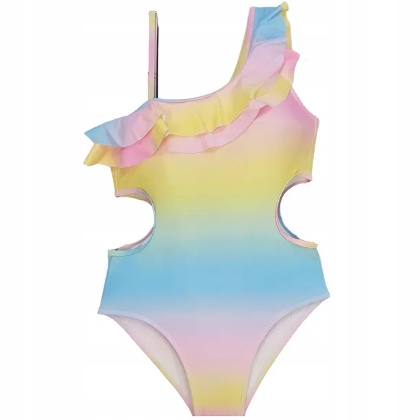 Jednoczęściowy kostium ombre w pastelowej kolorystyce. Jedno ramiączko wykończone śliczną falbanką, drugie cienkie z regulacją- dzięki czemu jest go łatwo dopasować do sylwetki. Oryginalne wycięcia po bokach. Strój idealny dla dzieci lubiących aktywnie spędzać czas podczas wakacji. Kostium kąpielowy będzie na pewno bardzo wygodny. Posiada dodatkowo wkładki, które można wyjąć. Kostium bardzo dobry jakościowo, posiada w przedniej części podszewkę.