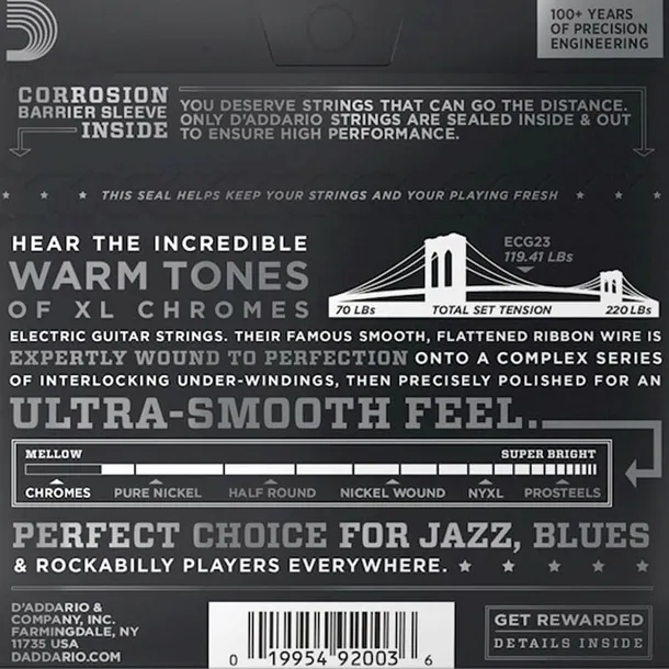 XL Chromes Flat Wound to struny ze spłaszczoną owijką z polerowanej na gładko stali nierdzewnej. Gwarantują one lekko stłumione ale bogate brzmieniecharakterystyczne dla tego typu strun. D'Addario Chromes to najbardziej popularne "flaty" na świecie.