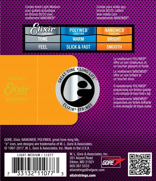 Struny Elixir to najbardziej znana na świecie marka strun powlekanych. Struny serii NanoWeb posiadają cienką powłokę z opatentowanego tworzywa GORE, dzięki której żywotność strun wzrasta nawet 5cio krotnie w stosunku do zwykłych strun. Oznacza to, że struny Elixir brzmią jak nowe nawet kilka miesięcy! Dodatkową zaletą powlekanych strun Elixir jest to, że są one bardzo przyjemne w dotyku, a charakterystyczny świst towarzyszący przesuwaniu palców po zwykłych strunach, w strunach Elixir NanoWeb jest zredukowany do minimum.