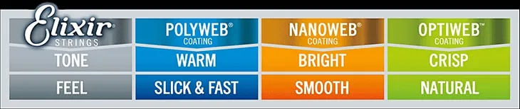 Struny Elixir dostępne są w kilku rodzajach oferując różne brzmienie oraz właściwości fizyczne.